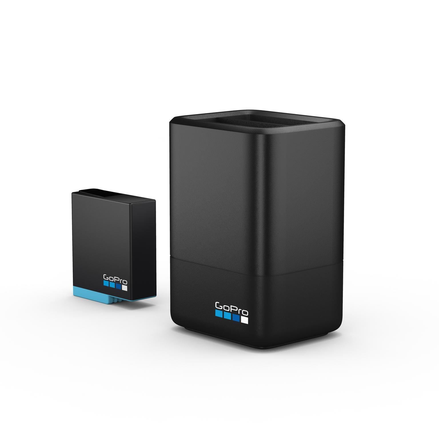 Pakke med batteri og batterilader for lading av to GoPro-batterier samtidig. 1220 mAh Li-ion-batteri. Laderen passer Hero 8, 7 og 6-batterier. Lader via USB.